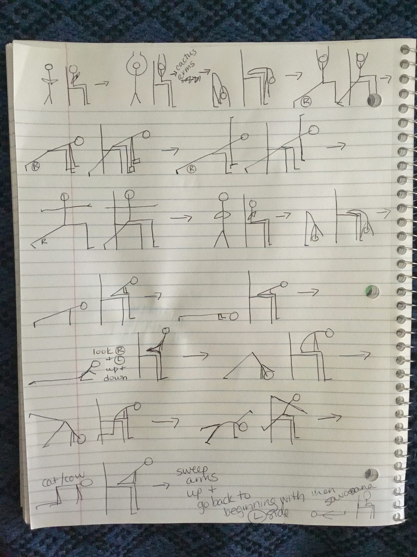 This week’s post will be short, but I’m including an audio yoga practice for this week with a focus on the neck and upper back. It’s a great practice to help combat the tightness we might experience after working at a desk, scrolling on devices, traveling, or driving. I’m also including a stick figure “map” of the poses as well. There will be 2 poses side-by-side so that you can pick which one feels best to you. One is a pose without a chair and one is with a chair. But, there will be only one audio to go along with the sequence. I hope you give it a try! I’m going to play around with this sequence over the next few posts, and what that means is that it will be the same sequence, but I will give different cues so that you can have different variations of practice within a sequence.